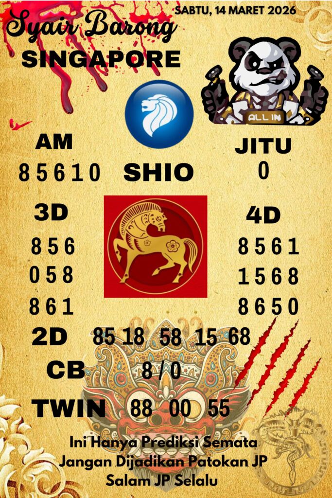 Code Syair Togel Singapore Resmi merupakan merupakan ramalan yang kedepannya menjadi prediksi singapore dengan menggunakan gambar yang berisi kalimat syair melukiskan keadaan dan situasi yang jalan. Wajarnya Syair togel bisa menurut cara ilmiah atau subjektif cuma dan terhitung juga bisa diambil berganti ada dari lebih pada 1point dasar seperti hasil ada dari angka keluar. Angka bermain atau colok bebas yang sesudah itu dibuatkan menjadi prediksi yang telah menurut pikiran subjektif ini bersama hati sendiri waktu buat prediksinya.